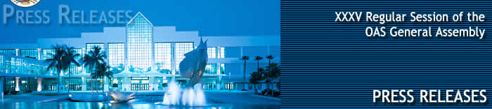 Home | Live Transmission | Press Releases | Basic Documents | Docs. for GA Photos: Previous - June 5 - June 6 - June 7 Videos: Previous - June 5 - June 6 - June 7 | Speeches | Previous Assemblies | General Information © Copyright 2005. Organization of American States. All Rights Reserved. Headquarters: 17th Street & Constitution Ave., N.W., Washington, D.C. 20006, USA Tel. (202)458-3000 Prepared by the Office of Public Information - Multimedia Unit. Terms of Use & Privacy Notice | Comments and questions